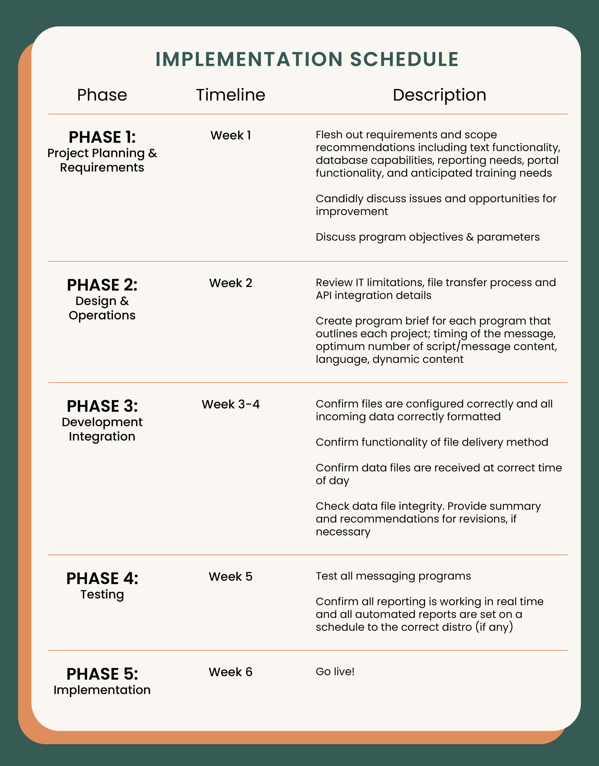 To keep everyone aligned, I reviewed the RFP scope and built an implementation RACI matrix that clearly defined all the key players, their responsibilities, and points of accountability during the project. I also prepared a detailed implementation plan that accounted for expected wait times on the client side — as well as testing and validation time on our end — ensuring the entire process ran smoothly and on schedule.